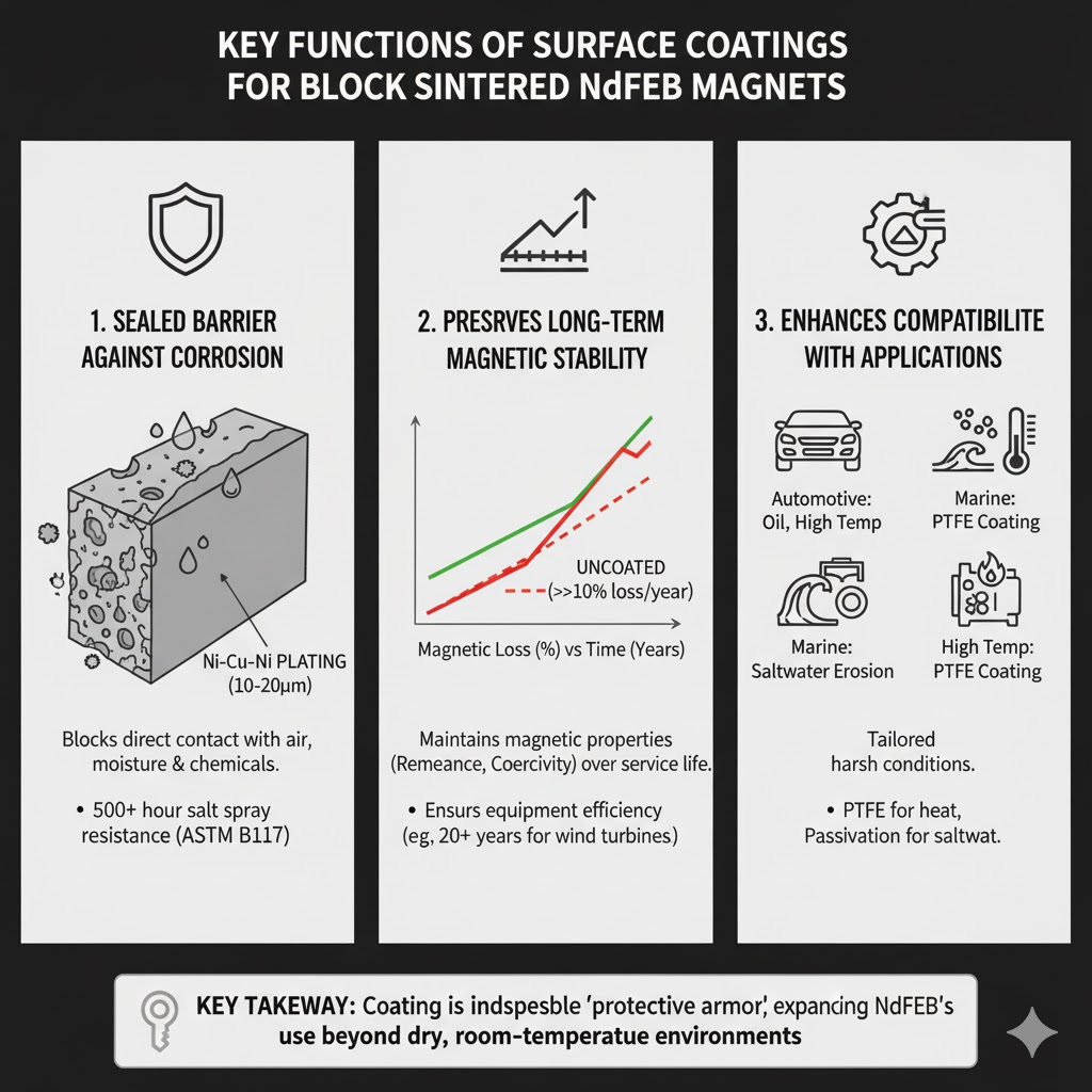 การเคลือบผิวทำหน้าที่เป็น "เกราะป้องกัน" ที่ออกแบบมาเพื่อรองรับช่องโหว่ของ Block Sintered NdFeB โดยตอบสนองฟังก์ชันหลักสามประการที่ขาดไม่ได้สำหรับการใช้งานจริง